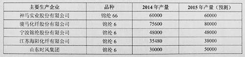 2014年锦纶帘布主要生产企业的产量和2015年预测(吨/年)