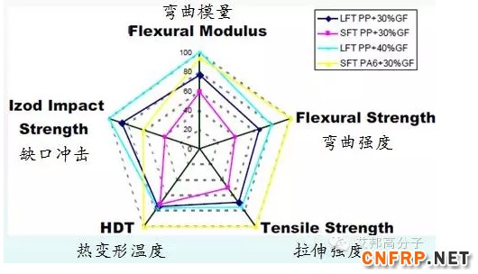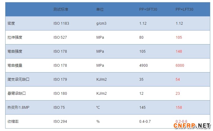 LFT-PP30%拉伸强度、弯曲强度、弯曲模量、冲击强度、热变形温度、收缩率都明显比SFT优异。