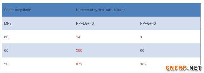 在80/60/50Mpa的压力幅度下,PP+LGF40的耐疲劳性能远远优于PP+GF40。