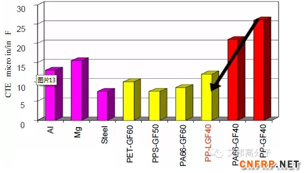 PP-LGF40的热膨胀系统与金属相近,并且远远优于PP-GF40。