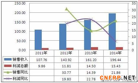 2014年,我国环境监测专用仪器仪表制造规模以上企业为93家,同比增长16.25%;资产总额达158.75亿元,同比增长40.35%;行业销售收入为196.44亿元,同比增长21.86%;利润总额为15.43亿元,同比增长6.46%;产品销售利润为26.36亿元,同比增长12.27%。从环境仪表仪器制造行业的销售规模来看,行业整体呈增长趋势。
