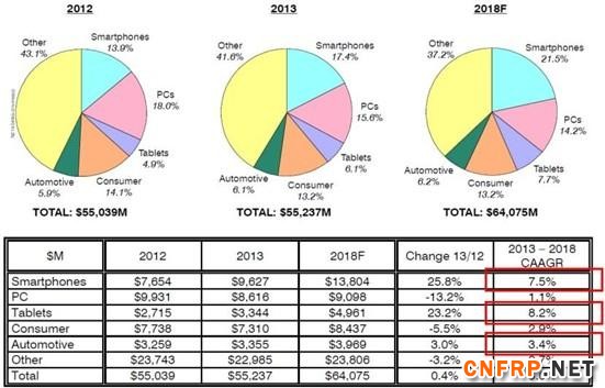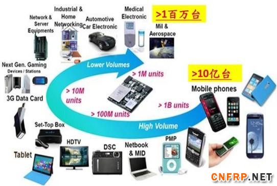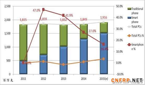 产品领域,以汽车电子(6.8%)、超级本(40.6%)、平板(15.5%)和智能手机(9.9%)为主要动能。汽车产量,2015年预估为9,045万辆(3.9%)。计算机出货量,2015年预估为3.25亿台(3.6%),其中超级本0.64亿台(71%)。平板出货量,2015年预估2.76亿台(16.4%)。手机出货量,2015年预估19.16亿台(3.6%),其中智能手机15.06亿台(16.4%)。