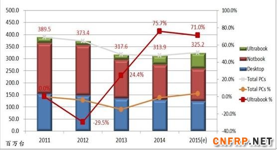 电脑市场整体情况较2011年衰退,但超级本是成长的。台机和笔记本,使用#2116布(E225纱)多。超级本使用#1080布(D450纱)多。