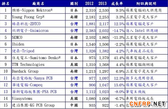 前15大PCB厂(2013年):