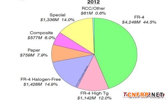 CCL产值(2012年):2012年总产值为USD 95.52亿元。FR-4基板为USD 68.18亿元,占71.3%。