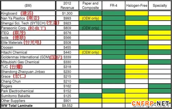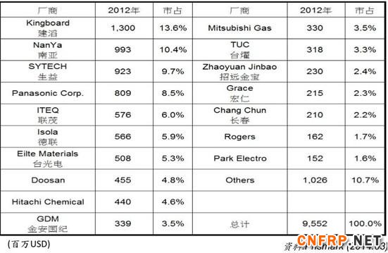 主要CCL厂排名(2012年):2012年主要17家CCL厂,占总产值的89.3%。