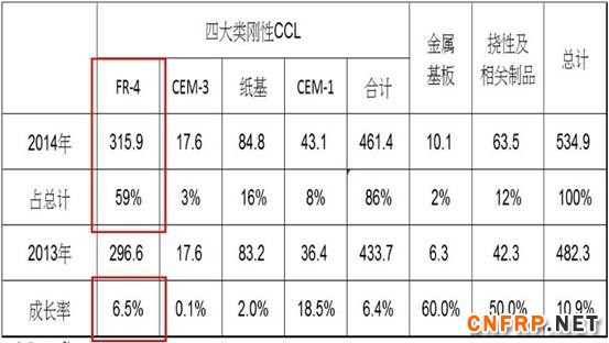 大陆CCL总产量-依种类:2014年大陆CCL总产量约5.35亿平方米,硬板约4.61亿平方米。其中FR-4基板约3.16亿平方米,占总产量近60%。成长量约6.5%。