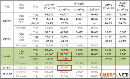 大陆CCL产量-FR4基板:2014年大陆FR4基板产量约3.16亿m 2 ,开动率约71.6%(近几年都是)。预估2015年可成长5.3%,产量达3.33亿m 2 。