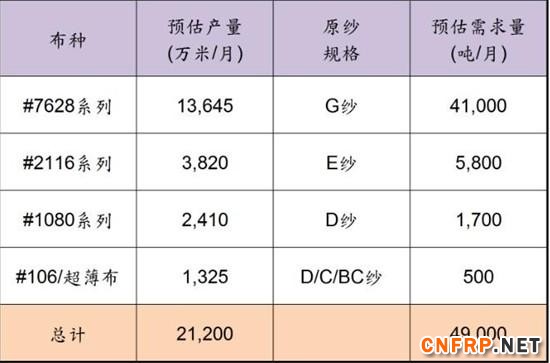 电子玻纤布的原纱需求:2014年电子玻纤布市场对电子玻纤纱的需求量,估算约4.9万吨/月。