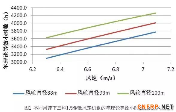 据统计,范围内年平均风速在 5m/s至 7m/s的低风速资源面积,占风能资源区的 68%,且接近用电负荷中心,并网条件较好。随着高风速优质风能资源开发趋于饱和受到“弃风”的影响,低风速风能资源的开发越来越受到关注。为使低风速风电场具备开发价值,低风速机组必须采用更长的叶片,以吸收更多风能。目前,国内已有多种低风速机型投入使用, 1.5MW低风速机组的大风轮直径已达 100m,2MW低风速机组的大风轮直径已达 121m。随着叶片长度和扫风面积的增加,切入风速和额定风速都明显下降。如风轮直径 100m的 1.5MW机组,其切入风速为 2.8m/s,额定风速为 9m/s。年平均风速为 5.5m/s时,年等效小时数大于 2000h,大大提高了风能资源的利用率。图 1为不同风速下三种 1.5MW低风速机组的年等效小时数对比(假设年平均风速为 Weibull分布,形状参数 k=2.0)。当年平均风速为 6.5m/s时,风轮直径 100m的 1.5MW机组比风轮直径 88m的 1.5MW机组年发电量提高约 16.1%。