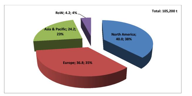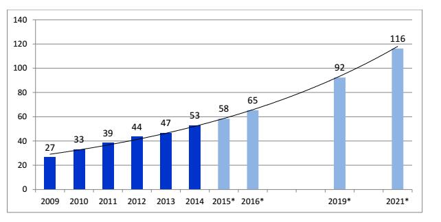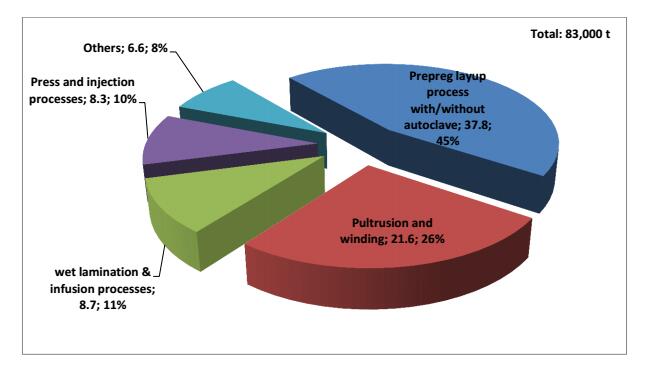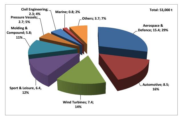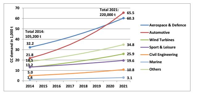 2014年碳纤维的需求量约为53000吨,略高于去年同期的预期数字,比上一年增长14%(46500吨),与金融危机后的2009年(26500吨)相比,需求增加了一倍。以2008年为起点(31500公吨),年增长率为9.1%,而2009年(26500公吨)的年增长率为14.9%。