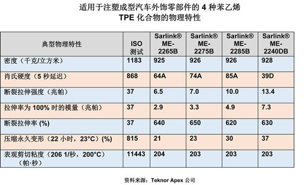通过开发在成本/性能方面可以替代广泛使用的热塑性硫化胶 (TPV) 的苯乙烯热塑性弹性体 (TPE),Teknor Apex 公司扩大了其适用于汽车外饰的“中性聚合物”产品线。新型 Sarlink® ME-2200 系列苯乙烯 TPE 具有比同类 TPV 更高的流动性,使外饰部件(如垫圈、密封件和装饰件)模压生产商能够加工复杂、精巧的设计,同时通过减少包装及冷却时间来缩短加工周期。在 TPV 化合物超出设计标准的应用领域,这些新型 TPE 化合物既能实现成本节约,同时仍能满足零部件的性能要求。与 TPV 一样,Sarlink ME-2200 系列化合物的密度低于 EPDM 和 PVC,重量相对于二者分别可以减轻多达 15% 和 23%。