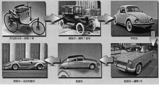 汽车车身造型的发展,随着汽车的诞生已经一百多年的历史,主要体现在外观造型、车身结构形式、车身材料等方面,而这几方面的发展不是各自独立的,而是相互影响和相互制约的。汽车造型的发展主要经历了马车型、箱型、甲壳虫型、船型、鱼形、楔形等阶段。如下图所示: