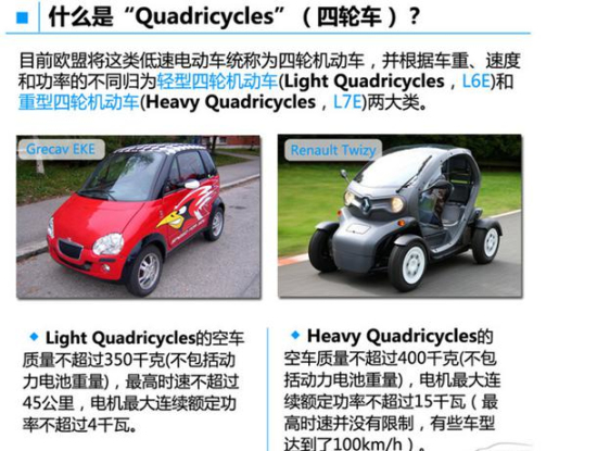 纵观国内外小型车的发展历史和趋势,结合业内支持低速电动车人士的普遍共识,我们可借鉴参考的有日本的“轻四轮车法”、美国的低速电动车标准LSV(全称Low Speed Vehicle)、以及欧盟规定的轻型四轮机动车Quadricycles。下图为欧盟定义的轻型四轮机动车标准: