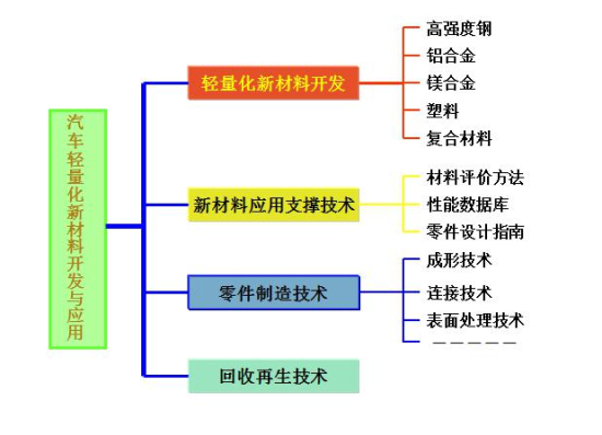 车身结构的轻量化具有双重特性,一方面,通过轻量化技术可以提高车辆的动力性,降低成本,减少能源消耗;另一方面,该技术对车身的强度、刚度将产生影响,进而影响整车的使用寿命。因此如何协调这两个方面的影响对车身轻量化技术的应用非常关键。车身的轻量化的主要技术路径大致如下: