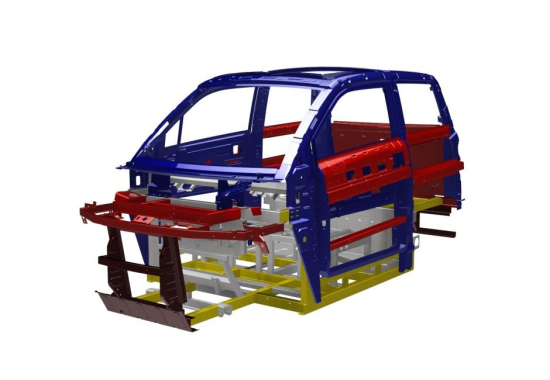 轻量化的趋势必然带来大量新材料、新工艺的应用,这也是低速电动车带给产业的技术进步,当然同时也势必影响到造型的结构。如福特的Thinkcity,韩国的E-zone,丰田coms等小型电动车大量采用了铝合金或高强度钢框架结构配合复合材料蒙皮的结构形式。通过搜索,发现国内的宏瑞世英电动车率先申请了电动车轻量化车身结构的发明,其款电动多功能车型宏瑞H3结构形式如下图所示,为高强度钢框架配复合材料外壳: