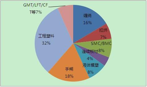 热塑性复合材料因其制件成型周期短、冲击强度高等特性得到市场认可,随着汽车、高铁、电子电气等领域的需求日益增加,热塑性复合材料蓬勃发展。国内热塑性复合材料仍延续了前两年的发展速度,在复合材料制品总量中的比例保持逐年稳定增长趋势,占国内纤维增强塑料制品行业总产量的38.6%。其中工程塑料产量146.4万吨,同比增长8.44%,仍是热塑性复合材料制品的主要类型。近年来随着GMT、LFT、LFT-D及CFT相关工艺与装备的逐步成熟,其产量和应用规模正在快速增长。重点玻纤企业加大对热塑性增强纱的研发与生产力度,以满足下游市场需求。各大装备企业加强对热塑复合材料成型工艺及装备的生产与研发。