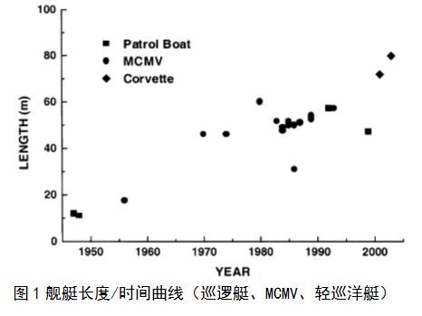 早期复合材料都是应用在小型巡逻艇和登陆舰上。相对差的制造质量和船体刚度限制舰艇的长度不能超过15米,排水量不超过20吨。近年来,随着低成本复合材料的设计、制备和力学性能的提高,复合材料开始应用在大型巡逻艇、气垫船、猎雷艇和轻巡洋舰上。图1是1945年到2000年间全复合材料海军舰艇的长度调查。随着时间的推移,舰艇的长度呈稳定的增加趋势,现在已有80到90米长的全复合材料海军舰艇。如果依此趋势,同时随着技术的提高,到大约2020年,可开始采用复合材料制备中等尺寸的军舰如120到160米长的护卫舰完全可能,但是,这是不可能的,除非采用复合材料造船的成本能够低于采用钢的成本。这部分综述了全复合材料海军巡逻艇、反水雷舰艇和轻巡洋舰的新进展,并简短介绍了复合材料在海军水翼艇上的应用。