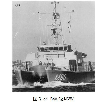 复合材料在MCMV上的应用,激发了舰体的设计创新,使得舰体能够抵抗局部翘曲、具有大的支架刚度以及优异的水下抗冲击性。舰艇操作者在选择舰体类型时,也考虑了其他标准,包括购买和维护成本、磁特性、声音阻尼性和耐火性。常见舰体结构是框架支撑的单壳结构、无框单层结构和GRP夹芯结构。采用这些设计制造的舰的实例如图3所示。