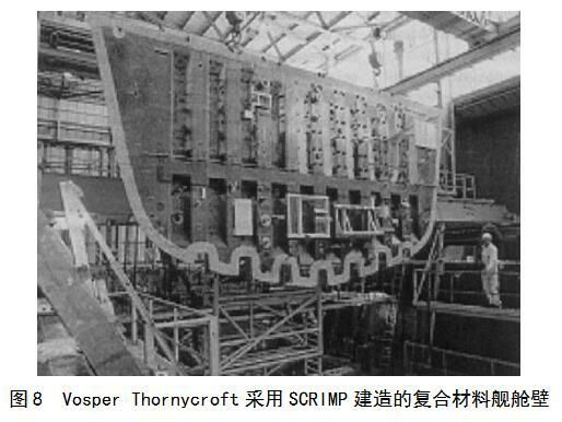 正在研究在海军钢舰艇上安装复合材料的舰舱壁、甲板、水密门和舱门的可能性。图8展示的是Vosper Thornycroft(英国)采用SCRIMP制造的一个复合材料舰舱壁。与钢舱壁相比,它的重量轻20-40%,具有更低的磁特性,发生火灾时对临近隔间的热传导低,并且具有更好的阻声性能。缺点是制造和安装的成本比钢舱壁的高20-90%。据预测,复合材料甲板也要比钢甲板贵30-45%。增加的成本主要是用于复合材料舱壁和周围钢结构的联结,以提供足够的抗力抵抗内部冲击损坏。除非这些费用能够降低,否则复合材料的舱壁和甲板很难在大型海军舰艇上广泛采用。