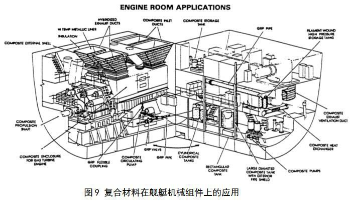 美国海军次考察了复合材料在舰艇引擎中的 应用,即评估GRP的齿轮罩外壳。与传统的钢外罩相比,复合材料外罩更耐腐蚀,而且轻90%,但是由于其噪音辐射更高,复合材料外罩再未使用。目前,美国海军正在评价轮机舱的机械部件上使用复合材料的可能性,如图9所示。玻璃纤维增强酚醛复合材料已经应用在柴油机的滑轮组、油盘、凸轮罩、水泵、油泵、滑轮、惰轮和调速链轮齿中。因此,重量可以减轻40-70%,引擎的购置成本可节省10-40%。另据预测,还可以降低结构和空气噪声5-20dB,降低电磁特性,提高耐腐蚀/侵蚀、耐磨和耐疲劳性能。虽然有这些优越性能,但目前复合材料引擎部件还未投入实际应用,在可以预见的将来这一情形仍将持续下去。