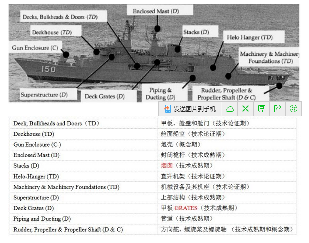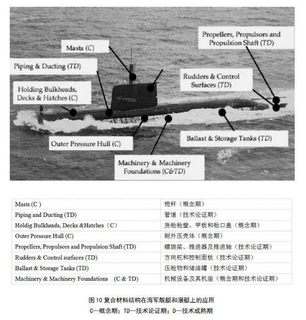 复合材料在军舰和潜艇上的各种新应用见图11。从图中可以看到,现阶段复合材料的应用分为下面几类:概念期 (C)、技术论证期(TD)或技术成熟期(D)。大部分的应用都处于技术论证阶段,尤其是潜艇上的应用。大部分技术已经成熟的应用仅限于相对较小的海军舰艇(巡逻艇,MCMV、轻巡洋舰),或大型舰艇和潜艇上的非结构性、非关键部件。
