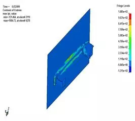 图5和图6为汽车保险杠系统有限元模型0.03s和0.05s时刻的应力云图。