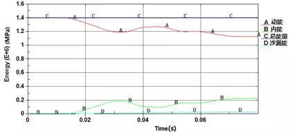 碰撞过程中汽车各部件的动力响应是一个涉及几何非线性、材料非线性和复杂的接触摩擦问题的大变形力学过程。在碰撞过程中,碰撞能量的主要传递途径是:(1)通过结构的弹塑性变形吸收一部分能量(内能);(2)通过碰撞车辆之间的速度再分配保留一部分碰撞动能。汽车碰撞过程表征了一个能量守恒、动量交换的瞬态过程,其动能大部分快速转变为变形能(内能),小部分以声能等其它能量耗散掉。能量变化清楚地表现在汽车的碰撞过程中。汽车碰撞开始是撞击体与被撞击体接触、变形由小到大,至大,而后两体回弹分离,本文中刚性墙不动,汽车将被弹回分离。图7为模型碰撞过程中的能量曲线。