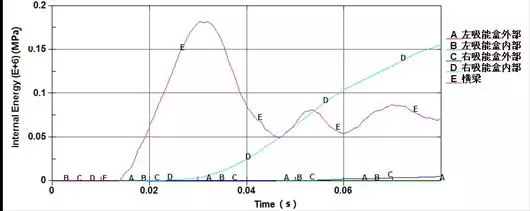 可以看出,在碰撞过程中,总能量是基本上保持不变的,虽然总能量略微有点降低,但这是由于有限元的能量计算算法所致,不影响仿真的准确性。保险杠变形量大的时刻是0.03s处,系统内能大,保险杠吸能比较充分,沙漏能的变化由图看出几乎与横坐标轴相重合沙漏能很小,仿真结果有效。