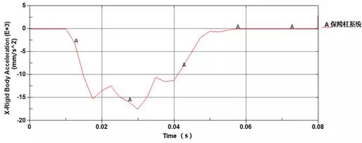 由图8可以得出左吸能盒几乎不吸收能量,碰撞产生的动能几乎都是由右吸能盒内部和横梁吸收,横梁大吸能量为0.175*106MPa大约占总吸能量的87.5%,右吸能盒随着时间的增加吸收的能量逐渐增加。这说明该吸能盒结构需要进一步改善,从而使左右吸能盒都能够发挥作用,从而减小在碰撞过程中右吸能盒的变形。3.3加速度分析加速度分析结果曲线如图9所示,由结果可知,在0.03s时刻加速度达到大,同时也证明了该仿真有效。