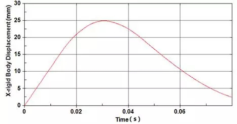由于车体的撞击方向是沿X方向的,速度为4km/h,Y方向和Z方向上的速度为0,所以保险杠系统的位移变化主要在X方向上,Y方向和Z方向上位移变化很小。保险杠系统正面撞击刚性墙后,X方向上的位移大响应如图10所示。