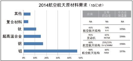 总的来说,铝是常使用的材料,占到了工业材料使用率的47%,合金钢以18%位列第二。超高温合金和钛合金所占比例分别为15%和11%。虽然碳纤维复合材料(CFRP)只占到了总需求量的4%,但是它是增长快的。根据ICF的预测,碳纤维复合材料(CFRP)的需求量预计每年会增长6.5%,钛合金将增长4.5%,超高温合金将增长2%。铝和合金钢的增长率预计在未来十年将保持平稳。