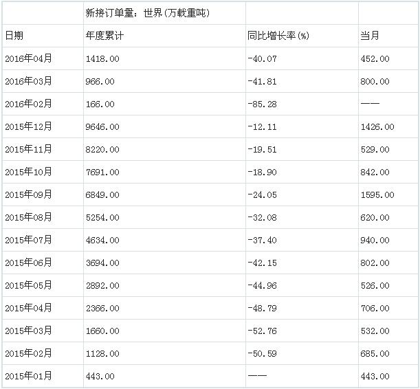 2016年4月船舶行业新接订单年度累计1418万载重吨
