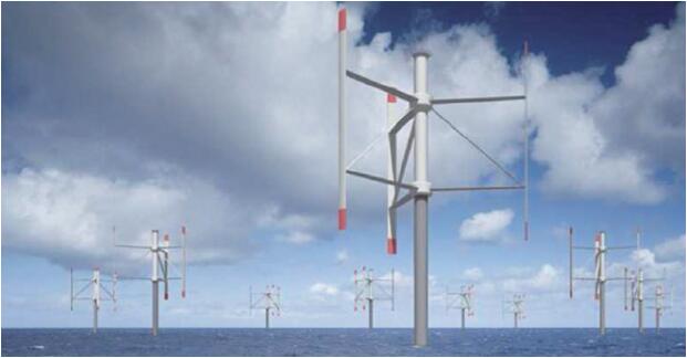 英资财团研究出了另一个VAWT概念,2009年由能源技术研究所作为新型近海垂直轴(NOVA)项目提出。VAWT由于其较低的重心而固有的稳定性是近海应用的一个显着优点,而HAWT具有的高度优势(在一个更强、更平稳的气流里运行)在海上则不太明显。NOVA 的研究基础是一个拴系的浮动机器,因此不需要塔楼或桩来固定。每个机器都包括一个中心轮毂,该轮毂含有发电机组和一个轴承,轴承上带有一个大直径的“V”型转子。后者由两个叶片构成,垂直角度约30°,并安装在从轮毂大幅向上倾斜延伸的径向臂上。