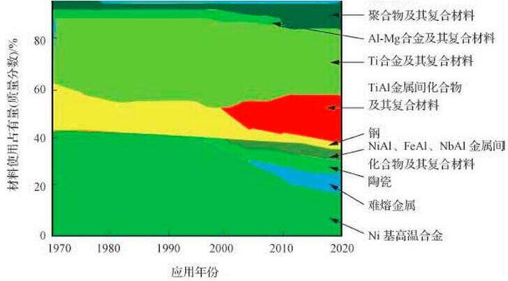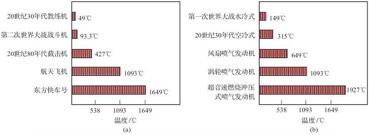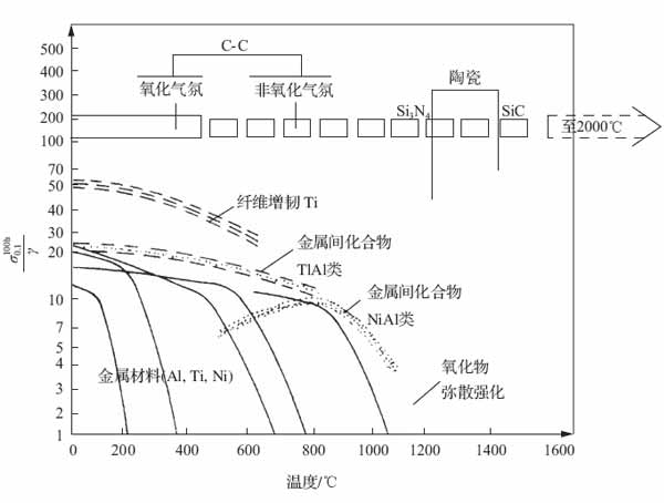 对于航空航天飞行器而言,除采用高强轻质合金外,制约其产品性能的另一类关键材料是高温材料。以飞机蒙皮为例,现在航天飞机的蒙皮温度高达1000℃,而航空发动机涡轮叶片承受的温度高达2000℃。因此,为了支撑航空航天产品在高温下的工作要求,许多新型材料如金属间化合物、陶瓷、碳/碳及各种复合材料正在加速发展之中,目的就是降低飞行器的结构重量,提高飞行器的结构效率、服役的可靠性及延长使用寿命。