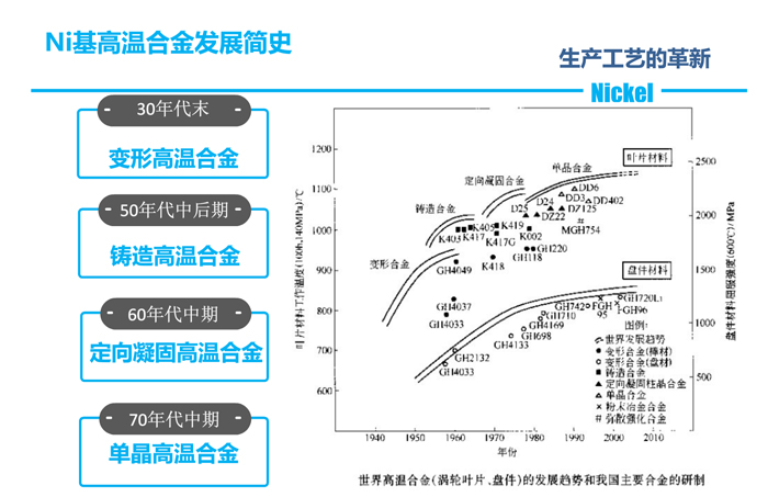 镍基超合金具有良好的高温蠕变特性、高温疲劳特性以及抗氧化、抗高温腐蚀等综合性能,满足了高推重比先进发动机的使用要求。为了使涡轮机叶片能够承受远超过Ni熔点的温度,除了升高Ni基超合金的使用温度外,还在基体表面涂敷绝热层 (TBC),以及采取冷却措施等降低基体温度。CMSX-10、Rene N6等含Re为5%-6%的第3代单晶体Ni基超合金,其使用温度达到1050℃ 。近年来美国通用电气公司(GE)、法国史奈克马公司(SENCMA)和日本材料科学研究所(NIMS)开发了第4代单晶体Ni基超合金,该合金不仅添加了Re,还添加了2%-3%的Ru,以提高合金组织的稳定性。 NIMS 研制了第 5 代单晶体Ni 基超合金,在第 4 代合金的基础上增加了 Ru 含量,使合金的耐用温度达到 1100℃ 。