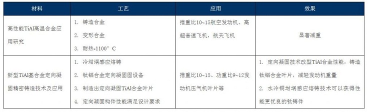 我国在航空航天领域,到2022年,先进材料与热工艺技术发展重点计划中也将高性能TiAl合金及冷坩埚熔铸和定向凝固作为研究开发的重点。