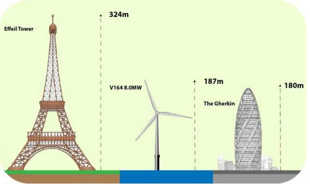 维斯塔斯V164-8.0单台就能为欧洲7500户家庭提供电力供应。安装完成后,风机塔高140m,风轮直径164m。