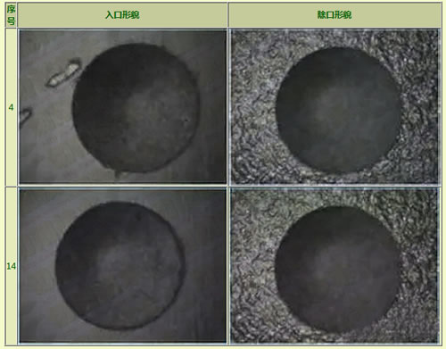 在上述参数下,制孔形貌如表3所示。两种参数均获得了良好的孔出口质量和入口质量,考虑制孔效率,优先选用转速8000rpm、进给速度80mm/min作为金刚石涂层硬质合金多面钻加工参数。