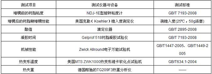 合成耐高温可增稠环氧乙烯基酯树脂、制备的SMC片材及其制品的性能参数测试仪器、设备及检测标准见表1.5。