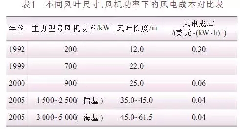 风电的价格和风机功率成反比,风机功率越 大,单位发电成本越低(表1)。随着现代风电技术的发展及日趋成熟,风力发电机组研究沿着增大单机容量、减轻单位千瓦质量、提高转换效率的方向发展。上世纪80年代早期到中期,典型的风电机组单机容量仅20——60kW;90年代初期,增加到500kW; 90年代中期,为750kW——1MW;90年代末,已达到 2.5MW;目前平均单机容量为1MW,大单机容量为5MW。预计2010年将开发出单机容量为10MW的风电机组。