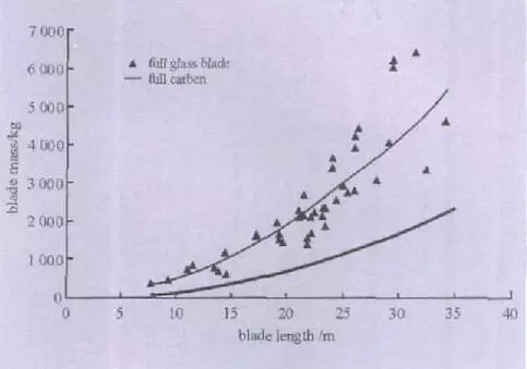 当叶片长度增加时,质量的增加要快于能量的提 取,因为质量的增加和风叶长度的立方成正比(图1),而风机产生的电能和风叶长度的平方成正比。同时随着叶片长度的增加,对增强材料的强度和刚度等性能提出了新的要求,玻璃纤维在大型复合材料叶片制造中逐渐显现出性能方面的不足。为了保证在极端风载下叶尖不碰塔架,叶片必须具有足够的刚度。减轻叶片的质量,又要满足强度与刚度要求,有效的办法是采用碳纤维增强。国外专家认为:“由于现有材料不能很好满足大功率风力发电装置的需求,玻璃纤维复合材料性能已经趋于极限,因此,在发展更大功率风力发电装置和更长转子叶片时,采用性能更好的碳纤维复合材料势在必行。”他们认为当风力机超过3MW、叶片长度超过40m时,叶片制造时采用碳纤维已成为必要的选择。事实上,当叶片超过一定尺寸后,碳纤维叶片反而比玻璃纤维叶片便宜,因为材料用量、劳动力、运输和安装成本等都下降了。