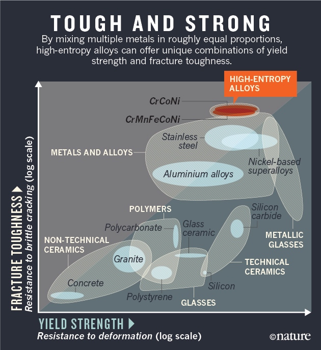 在关于半导体的研究中,我们已经有了很多材料化学方面的成就,这之后我们对掺杂的控制足以做到在金刚石网格结构中引入单原子点缺陷。这种精确的加工手段对于“高熵合金”十分关键,高熵合金是四到五种,甚至更多元素的混合物,拥有非常高的刚性,可被用来制作更轻薄、更有延展性的物品。虽然硬度和延展性是两种被认为互相排斥的属性,但一名来自MIT的冶金学家已经成功制造出同时极高硬度和极佳延展性的类钢铁的高熵合金,