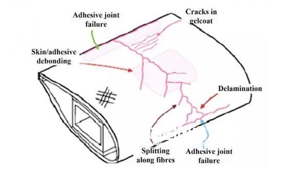 风电叶片在生产过程中产生的缺陷可能会在后续风力系统正常运作过程中发生变化,从而造成质量问题,其中为常见的缺陷就是叶片上的微小裂纹(通常产生在叶片的边缘、顶部或者尖端处)。而造成裂纹的原因主要来源于生产过程中的缺陷,如脱层等,通常发生在树脂填充不完善区域。其他缺陷还有表面脱胶、主梁区域脱层和材料内部的一些孔隙结构等,见图1。