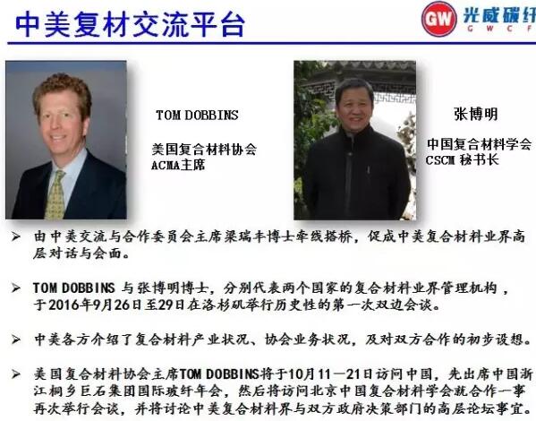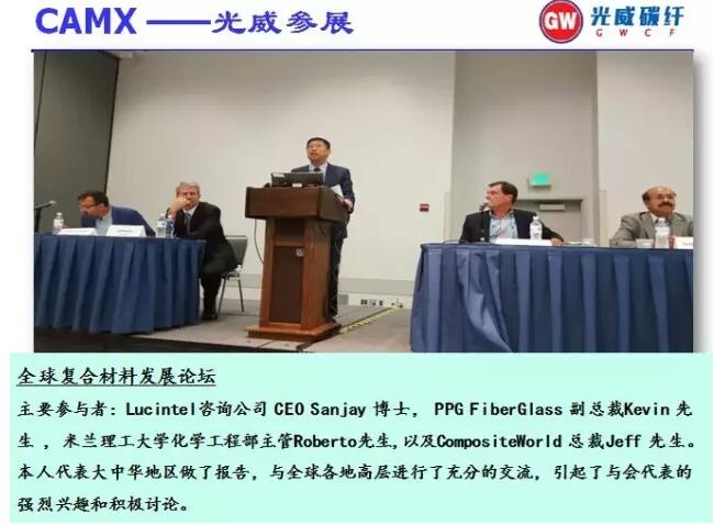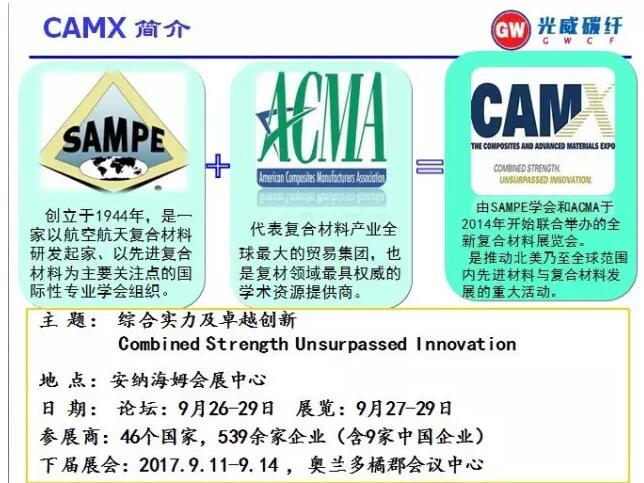 本文是2016年10月18日在威海召开的“SAMPE大陆总会高性能纤维专业委员会成立大会暨国产T700S碳纤维应用交流会”上,威海拓展纤维有限公司李书乡董事长做的关于参加2016年9月底美国“复合材料及先进材料展览会(CAMX)”的报告。经过作者李书乡董事长的同意,将本文分享给大家。