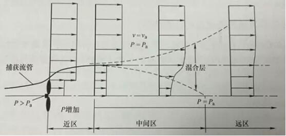 风力发电机组尾流的结构包括多个区域,如下图所示,它们分别是近区、中间区和远区。每个区的长度取决于风轮直径的大小,同时还与气压、风速和大气稳定度有关。