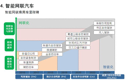 关于智能网联汽车的总体思路是近期以自主环境感知为主,推进网联信息服务为辅的部分自动驾驶(即PA级)应用;中期重点形成网联式环境感知能力,实现可在复杂工况下的半自动驾驶(即CA级);远期推动可实现V2X协同控制、具备高度/完全自动驾驶功能的智能化技术。