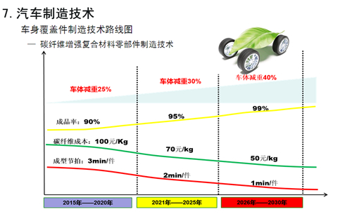 关于轻量化技术总体思路是近期重点发展超高强钢和先进高强钢技术,实现高强钢在汽车应用比例达到50%以上;中期重点发展第三代汽车钢和铝合金技术,实现铝合金覆盖件和铝合金零部件的批量生产和产业化应用;远期重点发展镁合金和碳纤维复合材料技术,实现碳纤维复合材料混合车身及碳纤维零部件的大范围应用。