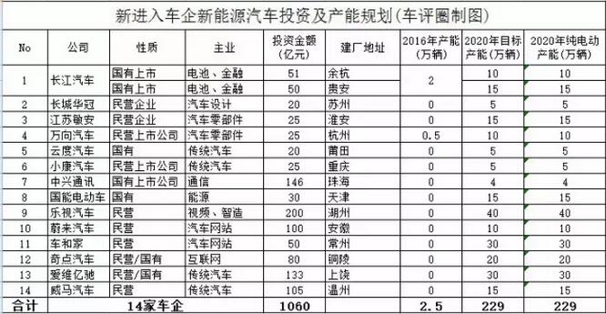 有14家企业是新进入者,这些企业为了制造新能源汽车,已宣布的投资金额达到1060亿元,到2020年,规划的产能将达到229万辆,且全部是纯电动车。他们愉快地甩掉内燃机这个累赘使得造车投资成本大幅降低,同时让制造难度也大幅度降低,不用再去开发一大堆车型平台。