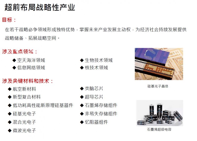 《规划》提出立足发展需要和产业基础,大幅提升产业科技含量,加快发展壮大网络经济、高端制造、生物经济、绿色低碳和数字创意等五大领域,实现向创新经济的跨越。着眼新一轮科技革命和产业变革的新趋势、新方向,超前布局空天海洋、信息网络、生物技术和核技术领域一批战略性产业,打造未来发展新优势。
